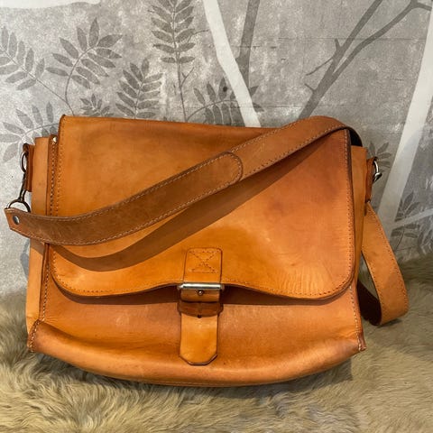 Enkel men kul skulderveske i skinn med nydelig brunfarge. Vesken er 26 cm bred, 22 cm dyp og 9 cm dyp