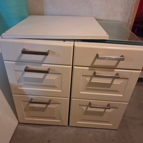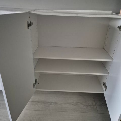 Demontert fra et Kvik-kjøkken. Det er montert fire bein på undersiden, slik at den kan brukes frittstående som en ekstra oppbevaringsseksjon på kjøkkenet, som jeg bruker den nå.