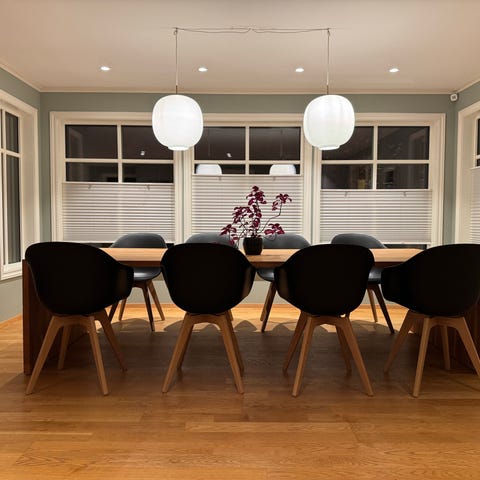 Spisebord i lys eikefiner med butterfly-ileggsplate med flott fiskebensmønster.