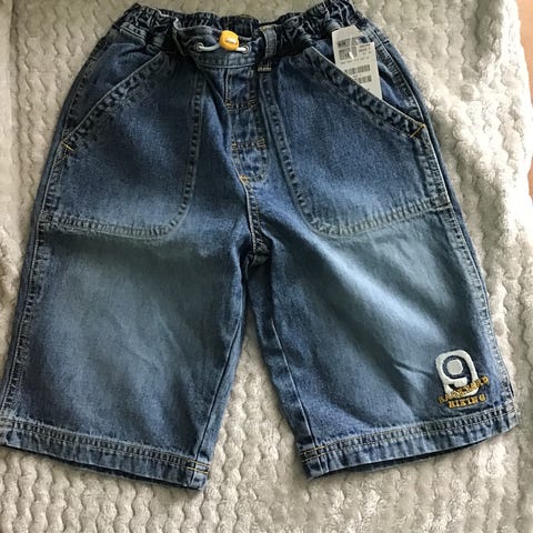 Dongeri bukse fra HM i strl 128. Strikk i livet som kan justere livvidde. Bomullstoff på innsiden av buksen.