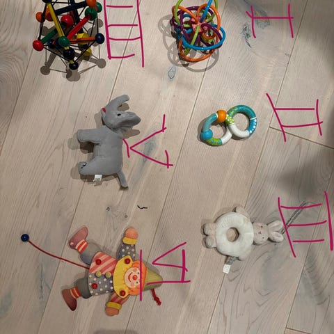 Diverse leker til baby. Rullespeil, rangler med lyd, Manhattan Toy Skwish Classic, biteleker, søt bamse og diverse.