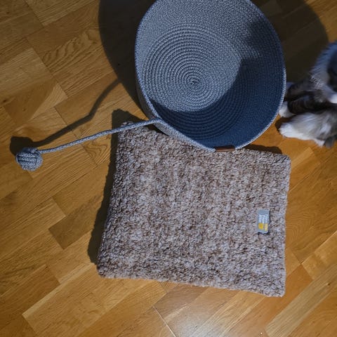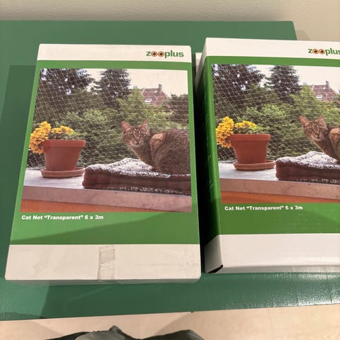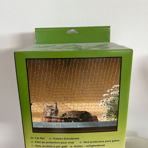 Kattenetting 2 ganger 3 meter. Mangler skruer for oppheng. Ikke synlig brukt utover det.