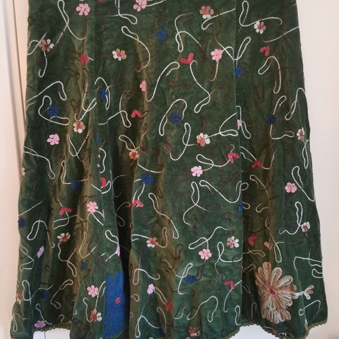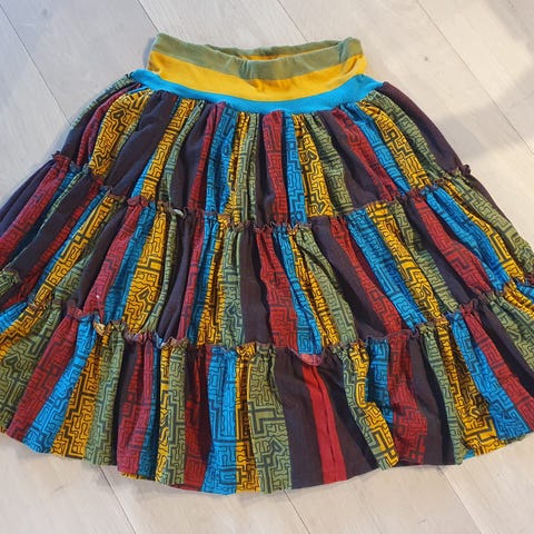 Flerfarget skjørt i bomull fra Desigual i størrelse M/38-40 selges for kr. 50. Skjørtet har et unikt design med forskjellige mønstre og farger i grønne, røde og oransje nyanser. Det er laget i et lett materiale, egnet for ulike anledninger.