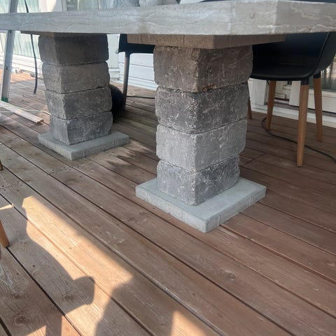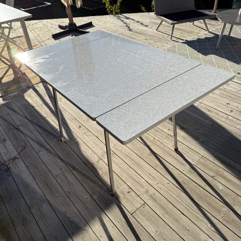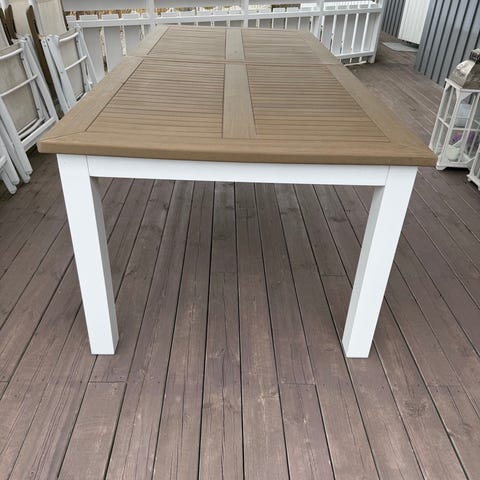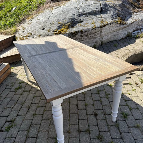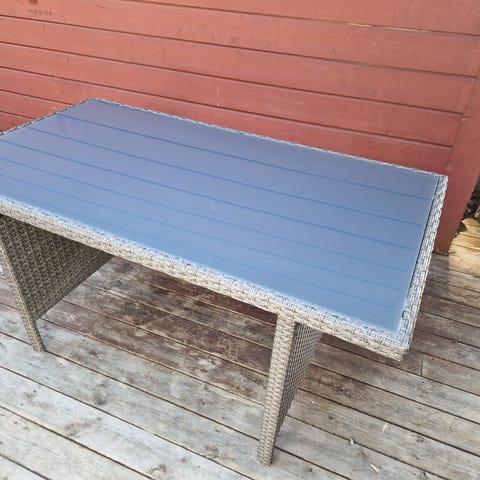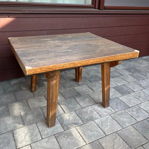 Utebord med rotting bein og påmontert osb plate. Påstiftet voksduk som er slitt og som må skiftes ut. Godt bruk, men med litt kjærlighet kan dette bordet ha mye bruk igjen.