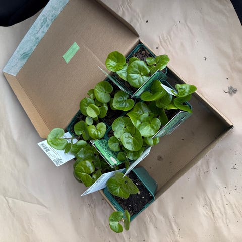 Selger fine hasselplanter fra egen hage. Små står i melkekartonger.
