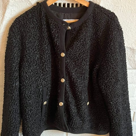 H&M jakke i størrelse XL, farge svart. Klassisk design med knapper foran. Ganske tykt fint stoff. Kort modell. Kun brukt i noen timer i et selskap, fremstår som ny.