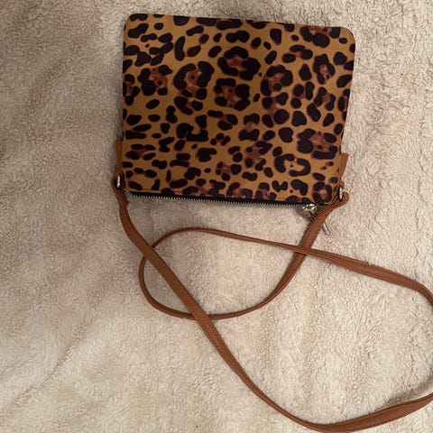 Romslig og praktisk med lenke. Kan bæres på skulder eller crossbody. Fóret. Lommer på innside.