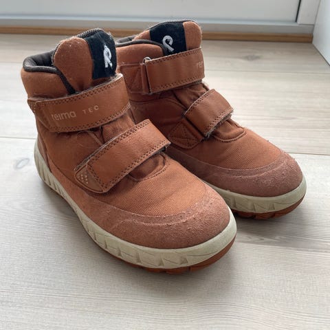 Godt brukte reima sko i fargen oker. De er kjempe fine sko for små barn og holder føttene gode og varme. De er brukt av ett barn i en sesong, men dessverre bremset med tuppen mens han har syklet. Derfor selges de veldig billige. Fortsatt mye bruk igjen. Og perfekt til barnehagen da de er billige og man trenger ikke være bekymret for at de dyre skoene blir ødelagte. :)