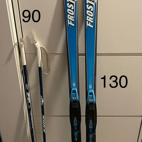 Et fint par smørfrie ski i str 130 med skistaver på 100 cm selges for 500 pluss eventuelt frakt