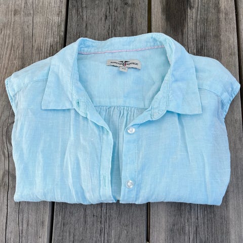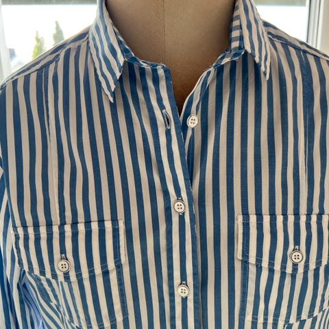 Selger flott linskjorte fra Max Mara Weekend i blå og hvit striper. Litt lang modell. Like fin som ny. Ny pris ca 3000.