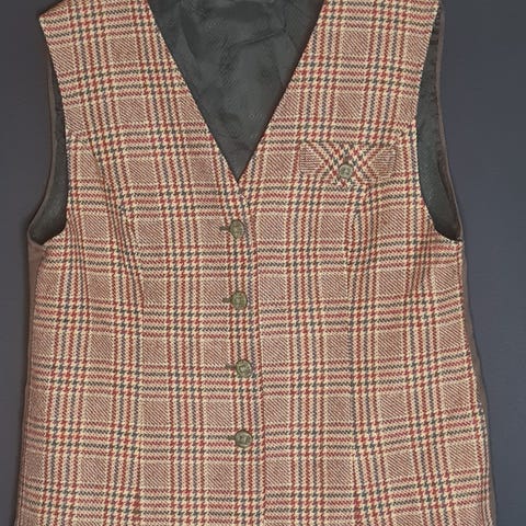 Vintage, grå/brun/oransje, blomstermønstret, vest med 3 store knapper og krage. Sjokoladebrunt for. Mangler stofflapp lapper, gjetter bomull/polyester (kan ta feil).