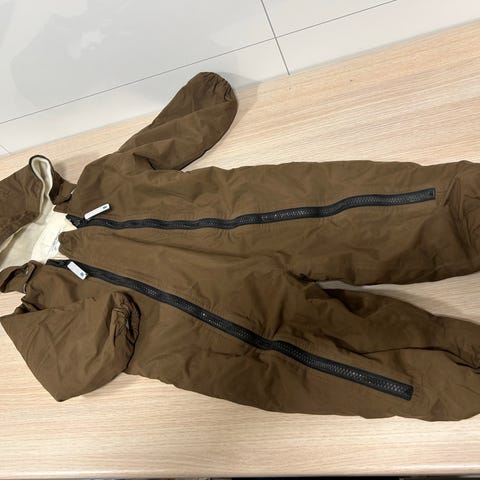 Pent brukt vinterdress i strl 80. Mørk blå. Praktisk dobbel glidelås foran. Avtagbar hette med fuskepels. Mangler forstrikk.