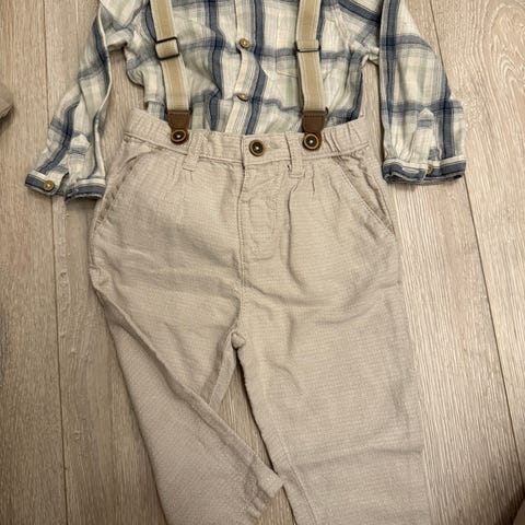 Skjorte og bukse med bukseseler fra "Kappahl", hvit skjorte fra "name It", blå et eller annet fra "MeMini" (kun brukt en gang til fotografering), og mørkeblå finbukse fra "Gant" 😊