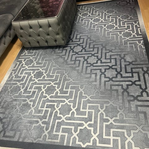 Fint teppe, men godt brukt. Ikke fått seg noe spesialvask, så har du utstyr så burde du kjøre det. Går man i detaljene kan man se noen små deffekter av slittasje eller flekker, disse ser man ikke uten å gå veldig tett på teppet. Store brune-gule flekker på baksiden. 7-8 år gammelt tror jeg, ikke brukt siste året. Fint stort teppe til priset av to glass vin.