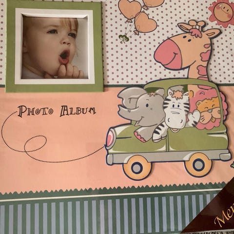 Selger to bøker for scrapbooking til baby. Den ene er i blå/grønn, den andre er i brun/rosa.