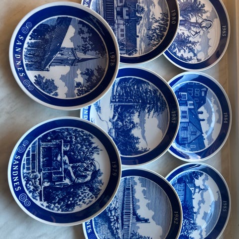 12 stk Bærumstalerkner med veggoppheng fra år 1977-1988. Utgitt av Civitan Club Bærum som samleserie. Laget av Porsgrunn Porselen.