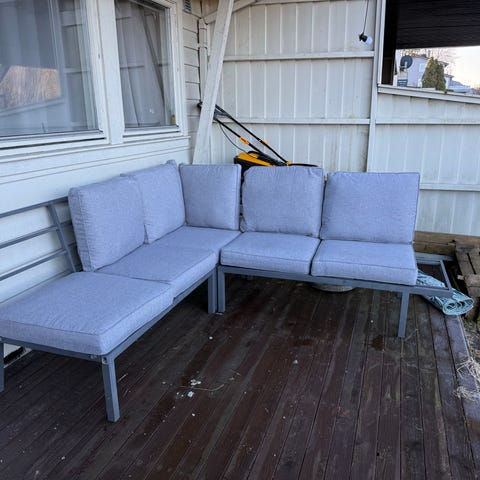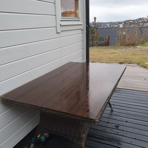 Gis vekk mot henting om noen vil ha, benken fikk seg en knekk i en storm ifjor, og ene planken på den ene stolen har tatt til seg en del fuktighet. Godt brukt og trenger nok litt kjærlighet. Går på bosset om ingen vil ha det.