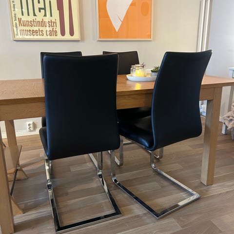 Selger 6 hvite skinn spisestoler kjøpt hos den nå nedlagte butikken ROOM på Vinderen og Habitat i Vika. Bein i krom.