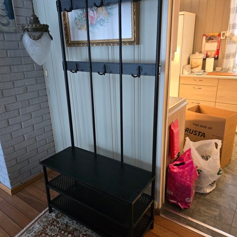 Selger praktisk og solid knaggrekke fra IKEA i sort metall med integrert benk og skohylle. Perfekt i gang, entré eller bod.