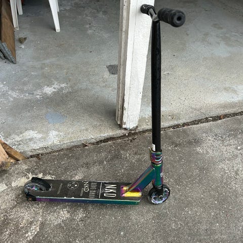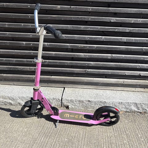 MGP sparkesykkel i lilla farge. Denne modellen har et unikt design med grafiske detaljer på styret. Sparkesykkelen er utstyrt med robuste hjul og en solid ramme, ideell for både nybegynnere og erfarne brukere. Passer til utendørs bruk og er lett å manøvrere.