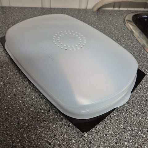 Tupperware CheeSmart. Lav rektangulær boks til oppbevaring av ost i kjøleskap. Fungerer også fint til annet pålegg, og som serveringsfat.