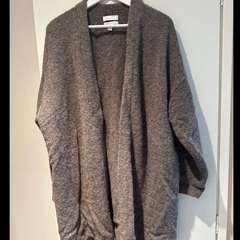 Lang, mørk beige strikkejakke fra Marie Philippe, størrelse S. 83 cm lang, 53 cm rundt brystet.