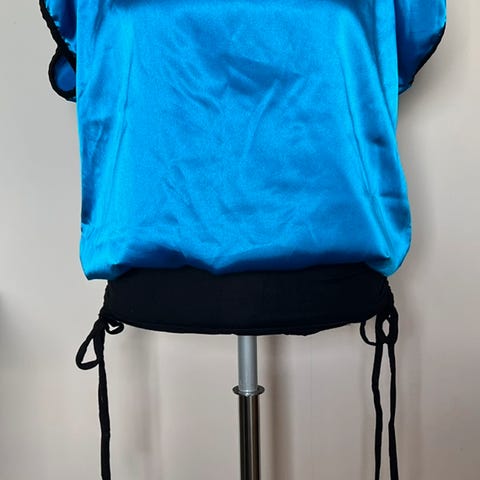 Selger en kjole/tunika/topp i kimonostil fra Floyd by Smith. Fargene er lys blå/turkis og sort. Stoffet er sateng med litt stretch.