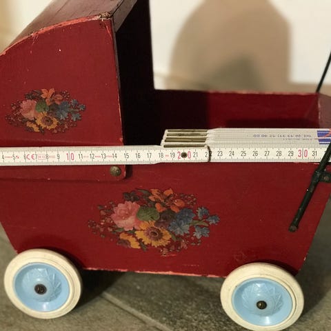 Gammel dukkevogn fra slutten av 40 tallet. Den er ideell for dekorative formål eller som et samlerobjekt.