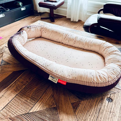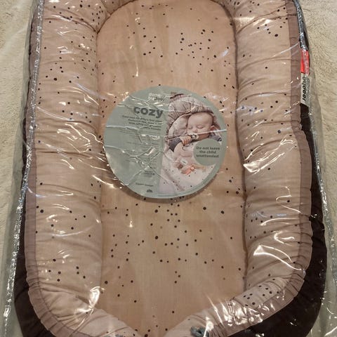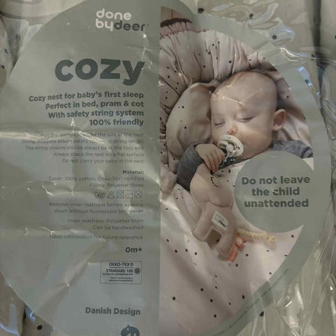 Selger Cozy Nest fra Done by Deer. Komfortabel og trygg soveplass for babyer. Trekk i 100% økologisk bomull. Hevet kant i fast skum.
