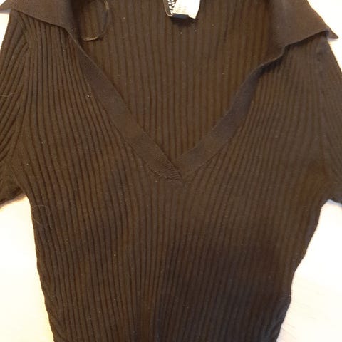Kul genser med knyting i ryggen. Den er kort i livet og har lange ermer, med hull til tommelen. Passer også til str 158 og 164.