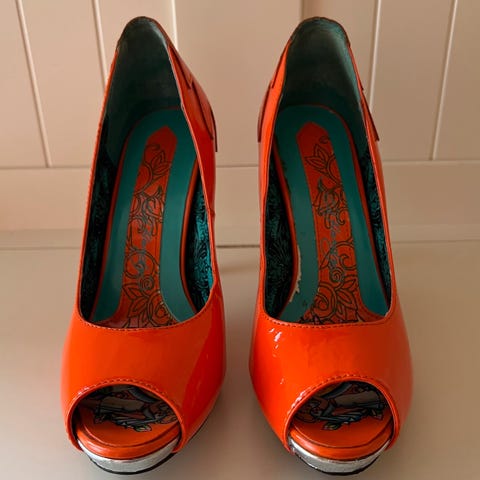 Jeg har også en matchende Ed Hardy «Love Kills Slowly» canvas knalloransje Y2K veske med swarovskikrystaller og et par matchende pumps.