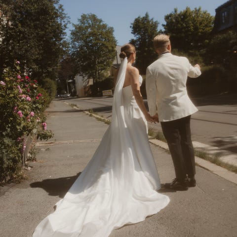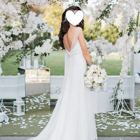 Selger min nydelige brudekjole i silke, skreddersydd og kjøpt i brudesalong. Kjolen har en vakker V-skjæring i ryggen med delikate perlebroderier, et søtt belte med blomster og en sløyfe bak. På sløyfen er det festet et smykke som kan kjøpes med om ønskelig.