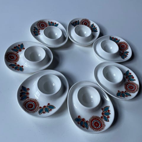 Selger et komplett sett med 6 eggeglass, produsert på 60- tallet. Perfekt for retro- entusiaster, samlere eller hyggelige frokoster hjemme. Perfekt gave. Pent behandlet, ingen sprekker eller skader. Selges samlet