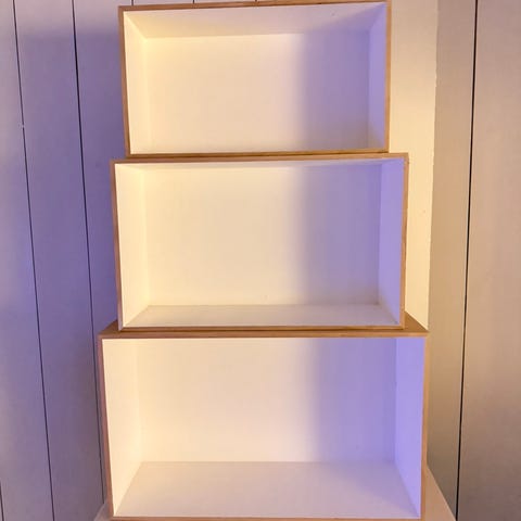 Boksene er helt fine, bortsett fra at noen av de har vannskjolder (se bilder). Disse kan stort sett skjules ved å plassere siden ned/mot vegg.