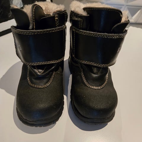 Gode og varme vintersko som er vanntette, størrelse 22. Enkle å ta av og på. Se bilde nr 5 for mål av utvendig såle (innersålen sitter fast). Ingen anmerkninger.