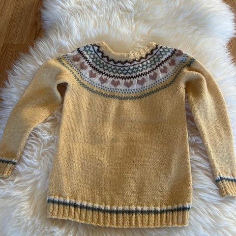 Helt ny hjemmestrikket Lillefjellgenser str 10 - 12 år. Strikket i Lanett Superwash 100% merinoull . Måla er som følger.