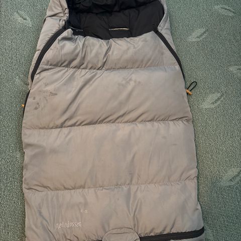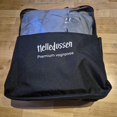 Tykk vognpose fra Helledussen, kommer med en forlengede del som festes med glidelås. Det er noen synlige flekker, men regner med det forsvinner i en vask.