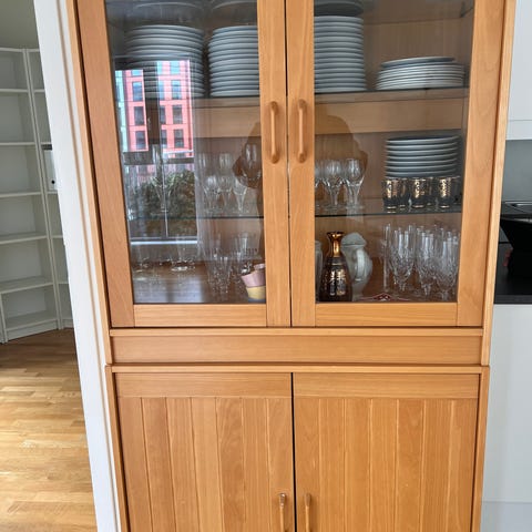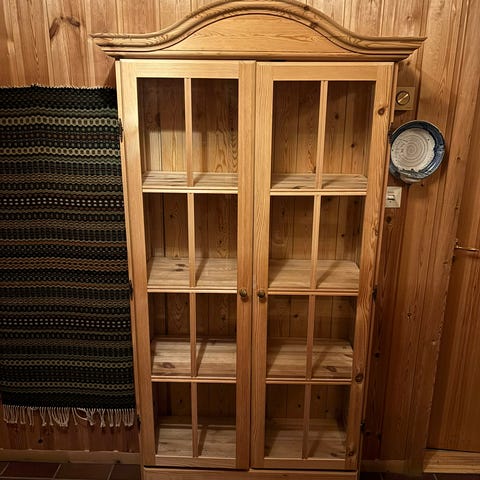 Pent brukt hjørneskap med glassdør gis bort mot henting. Veldig pent brukt og praktisk fasong, perfekt til å utnytte ubrukt plass i et hjørne. Varmt tre, god kvalitet. Hentes på Sotra utenfor Bergen.
