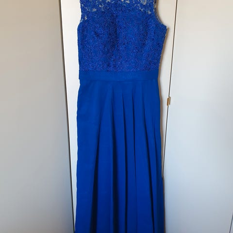 Søkeord: galla, ball, penkjole, festkjole, fest, selskapskjole, ballkjole, gallakjole, lang kjole, lang selskapskjole, bryllupsgjest, kjole til bryllup, konfirmasjon, blå kjole, mørkeblå kjole, blondekjole, kjole med perler, chiffonkjole, elegant kjole, sjal i sølv, sjal i glitter