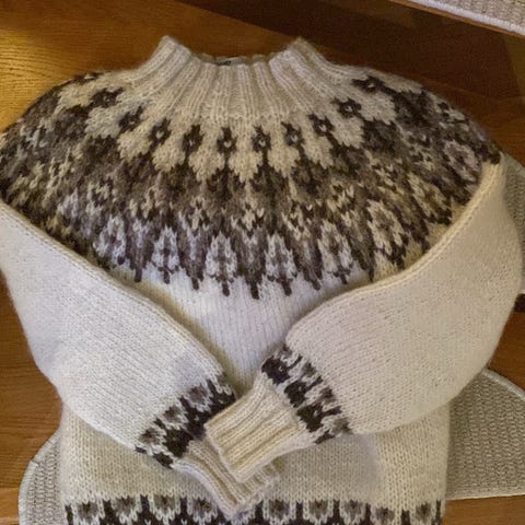 Nystrikket genser i Alafosslopi med dekkhår og underull, vannavstøtende og utrolig varm. Str L. Hel lengde : 75 cm. Arm: 53cm.. Btystvidde: 57.. Pannebånd