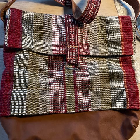 Stor vintage veske i tøy selges kr 700,- pluss eventuell porto kr 69,- med PostNord. Ca 54 cm høy, ca 53 cm bred. Glidelåset i den lille lommen inni er litt treg. Kan brukes som crossover. Ekte speil som er brodert fast, kjempefint mykt for inni, lagd av gamle stoffer.
