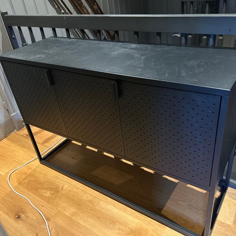 Brunbeiset tv benk/skjenk med 2 forseggjorte skap på hver sin side og et åpent rom i midten.