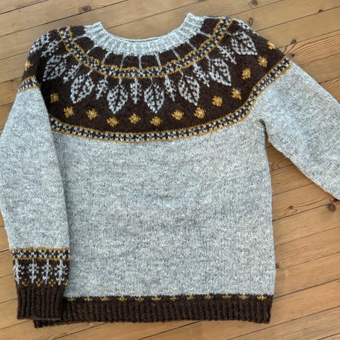 Hjemmestrikket "Celeste" genser strikket i Double Sunday (100 % merinoull) til salgs. Genseren er strikket som modell og har ikke blitt brukt.