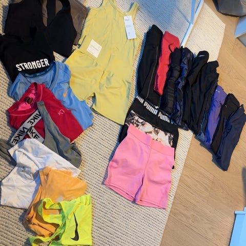 Selger diverse pent brukte tightser og overdeler fra gymshark. Det er kun den sorte energy seamless tightsen som har blitt godt brukt, ellers så er de andre ikke brukt eller veldig lite brukt. Toppene er og i god stand og lite brukt.