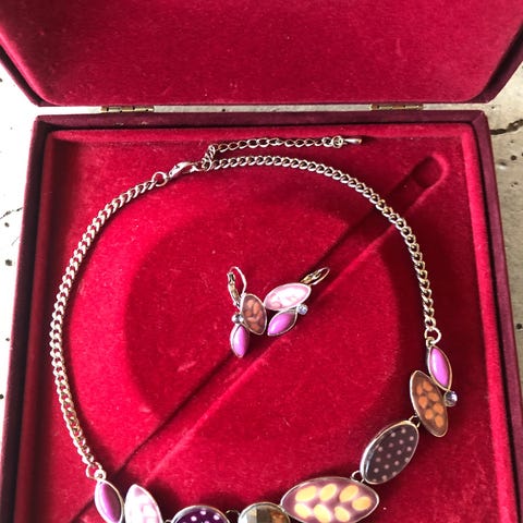 Selger dette fine smykkesettet fra Pilgrim som består av et halssmykke, øredobber og en ring. Smykkesettet kommer i en lilla boks kjøpt i butikken Klondike for mange år siden. Smykkene er lite brukt og er i svært god stand. En fin gave til noen du er glad i eller kanskje til deg selv?