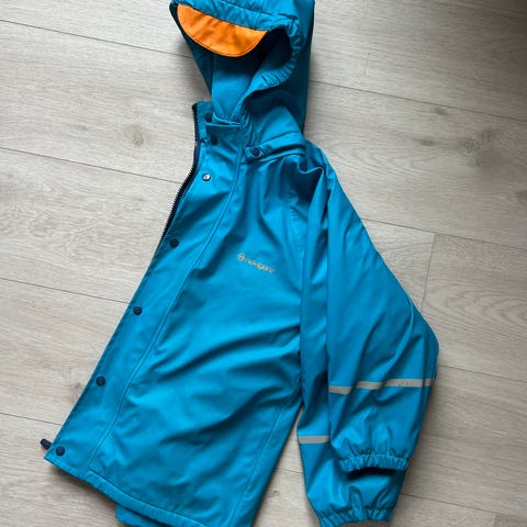 Litt slitt på ærmene men like helt. Buksen mangler strikk på ene foten og refleks litt løst. Regntøyet er helt uten noen hull.