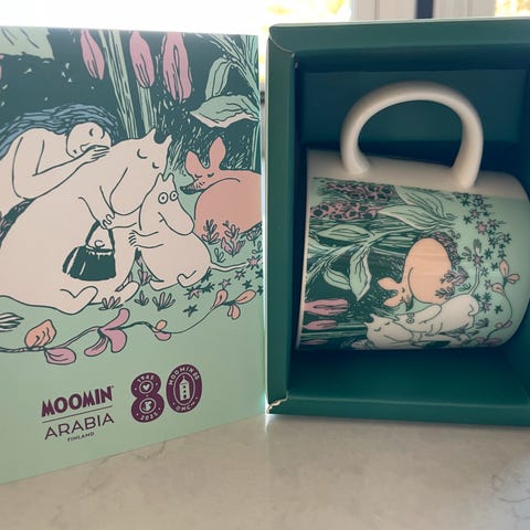 «Koppen har en helt unik detalj inni – Mummimamma og Mummitrollet som klatrer opp en stige. På undersiden av koppen finner du Moomin 80-stempelet som brukes til å feire årets jubileum. For Mummidagen 2025 er ekstra spesiell siden vi feirer hele 80 år med mummimagi. Koppen leveres i en eksklusiv gaveeske pyntet med fine Moomin 80 detaljer.»