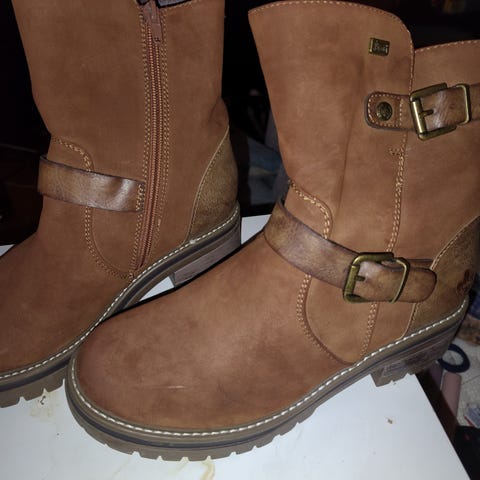 Boots fra Tamaris med en blanding av pent, semsket stoff og værbestandig gummi. Khaki / grønn farge med solid, chunky hæl. Størrelse 39, passer 39/40.