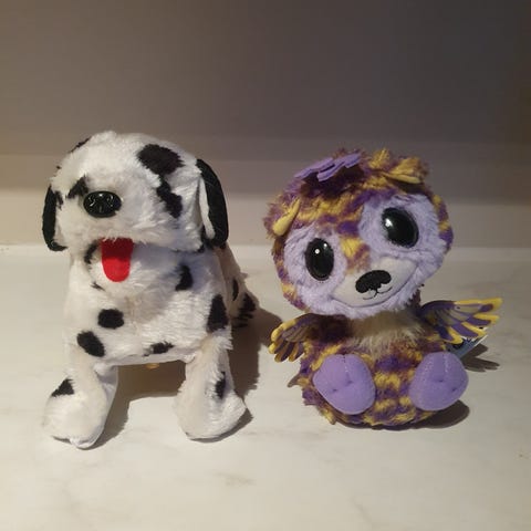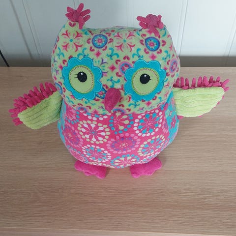 🦉 i mykt klemvennlig i velur i sterke farger med mønstret stoff. Broderte øyne og plysj nebb.