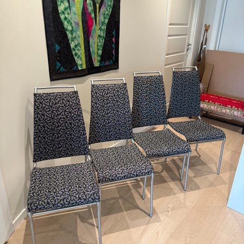 6 behagelige spisestuestoler kjøpt på Skeidar. Noen flekker som nok kan vaskes bort. Putene er avtagbare og kan vaskes.